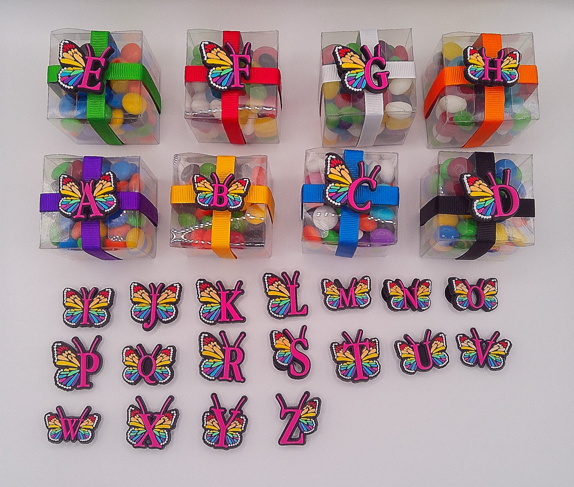 Alphabet Butterfly shoe charms with clear box of lollies