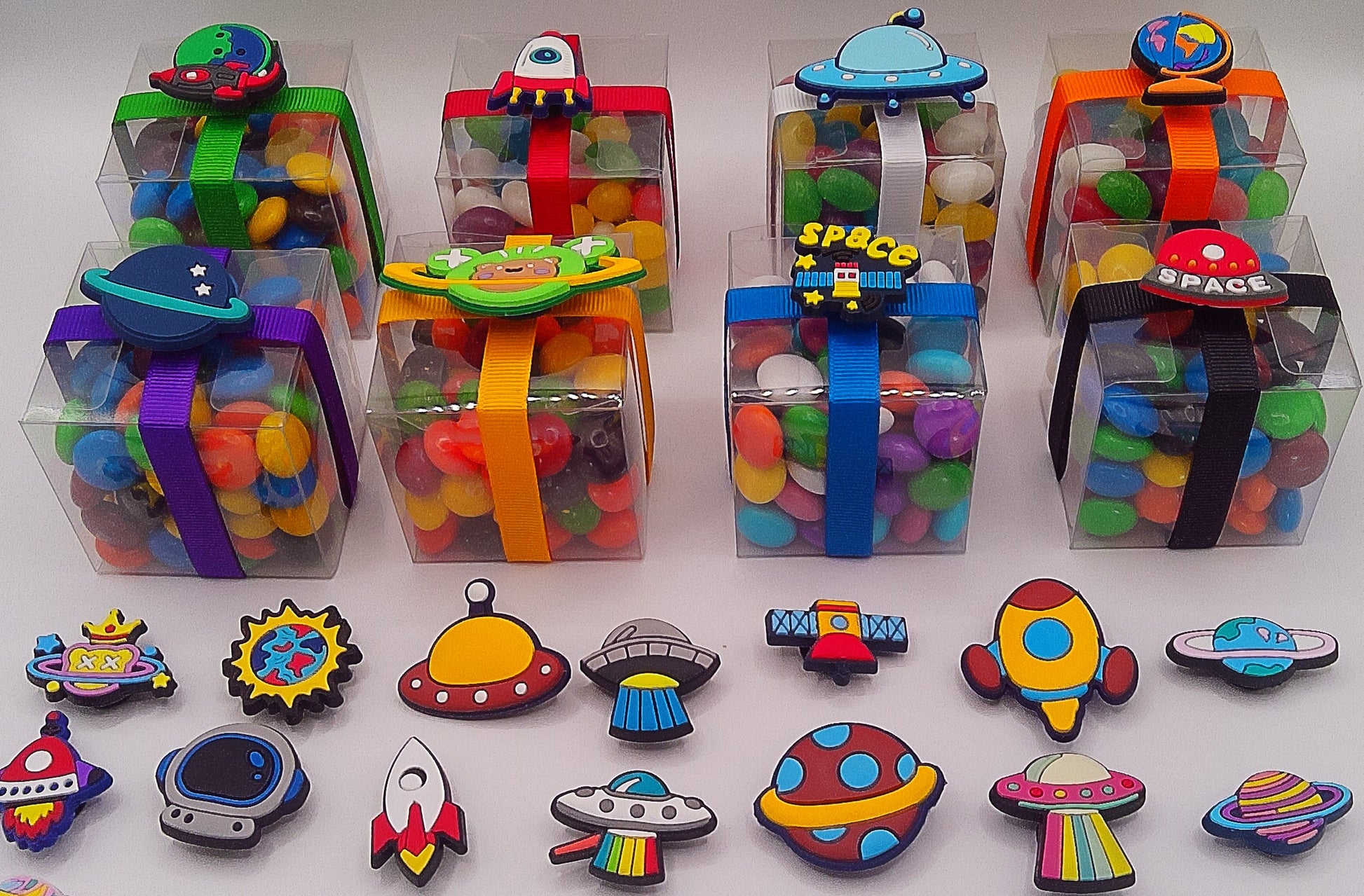 Space themed shoe charms with clear box of lollies