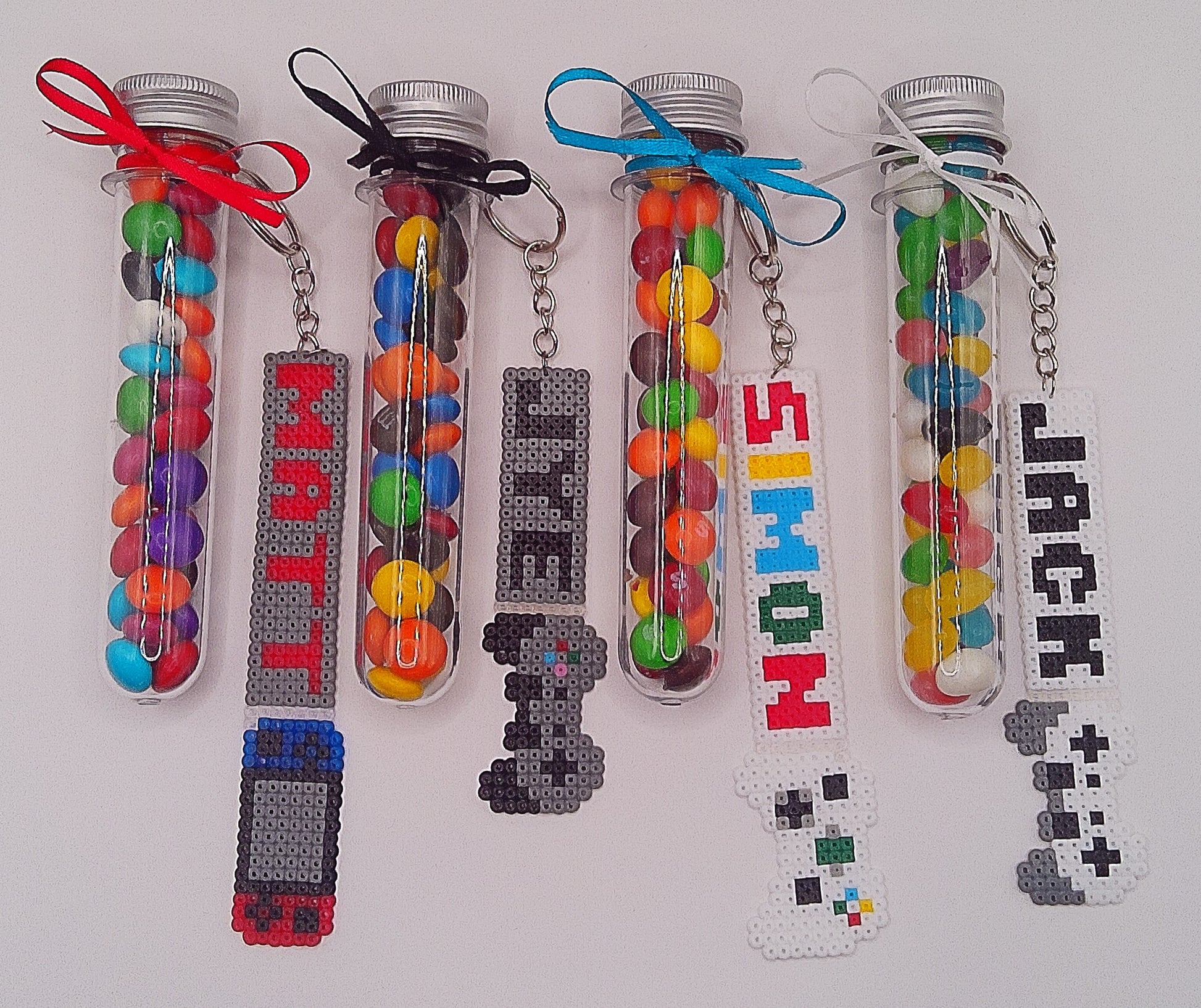 A plastic test tube filled with Jelly beans or M&Ms. A fuse bead personalised gaming keychain is attached with ribbon.