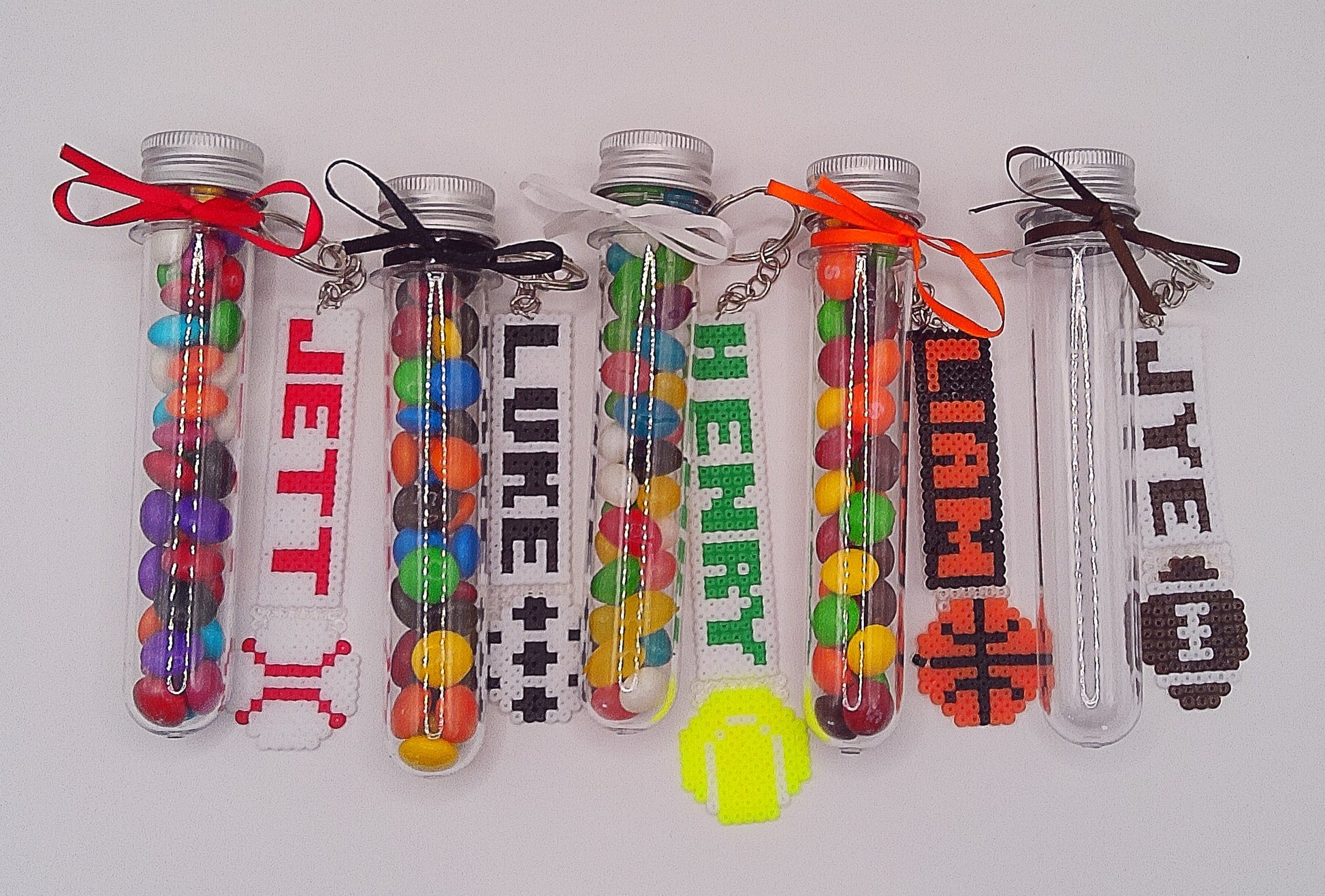 A plastic test tube filled with Jellybeans or M&Ms. A personalised fuse bead sports keychain is attached with a ribbon.